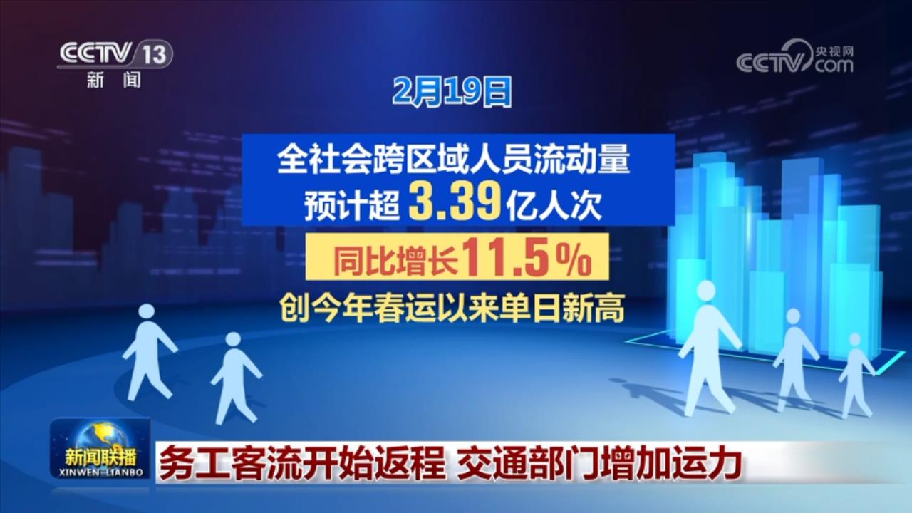 央视网消息(新闻联播):记者从交通运输部获悉,2月19日全社会跨区域人员流动量预计超3.39亿人次,同比增长11.5%,创今年春运以来单日新高。