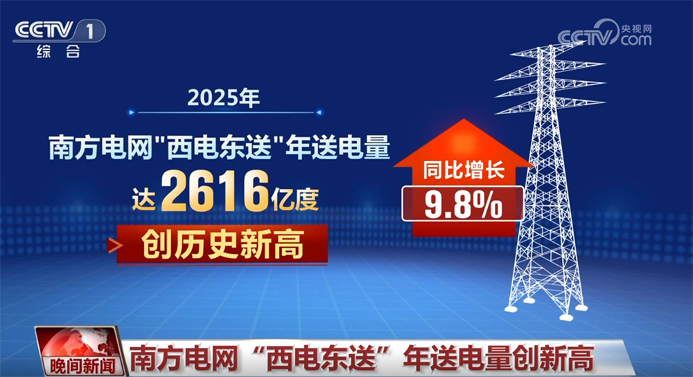 记者1月4日从南方电网了解到,2025年,南方电网西电东送年送电量达2616亿度,同比增长9.8%,创历史新高。在粤港澳大湾区,数字经济、先进制造等产业蓬勃发展,用电需求刚性增长,带动广东成为全国首个用电负荷突破1.6亿千瓦的省份。