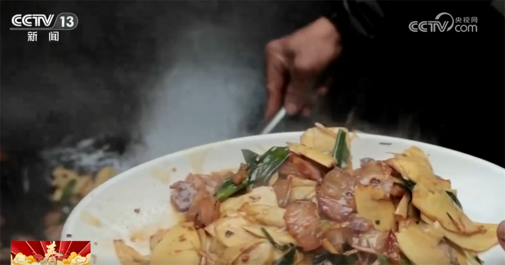 锅气未尽,酸菜入锅。笋丝与酸辣椒同炒,酸香开胃,清新解腻。以嫩笋为主题的菜肴陆续出锅,灶间飘香,满屋暖意。
