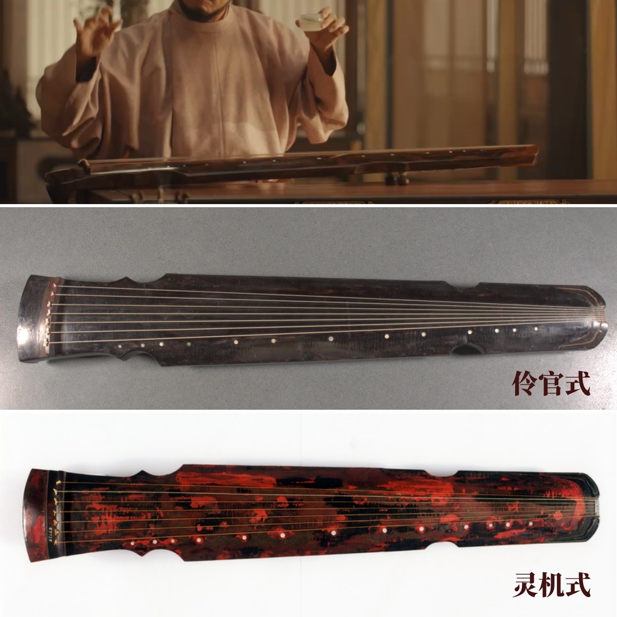△中图为浙江省博物馆藏唐伶官式“谷应”七弦琴,下图为湖南省博物馆藏唐“独幽”七弦琴。