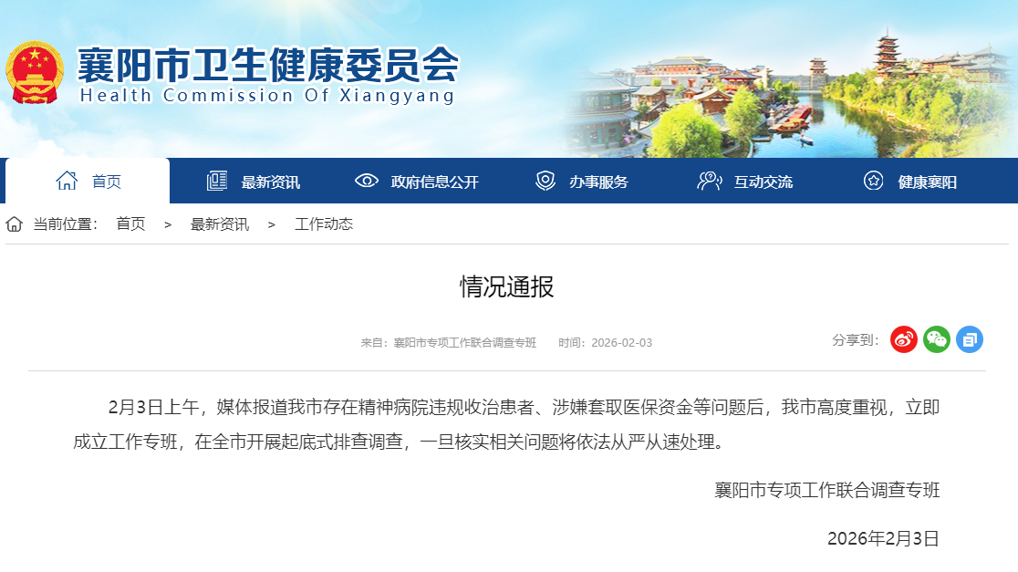 央视网消息:襄阳市专项工作联合调查专班通报:2月3日上午,媒体报道襄阳市存在精神病院违规收治患者、涉嫌套取医保资金等问题后,襄阳市高度重视,立即成立工作专班,在全市开展起底式排查调查,一旦核实相关问题将依法从严从速处理。