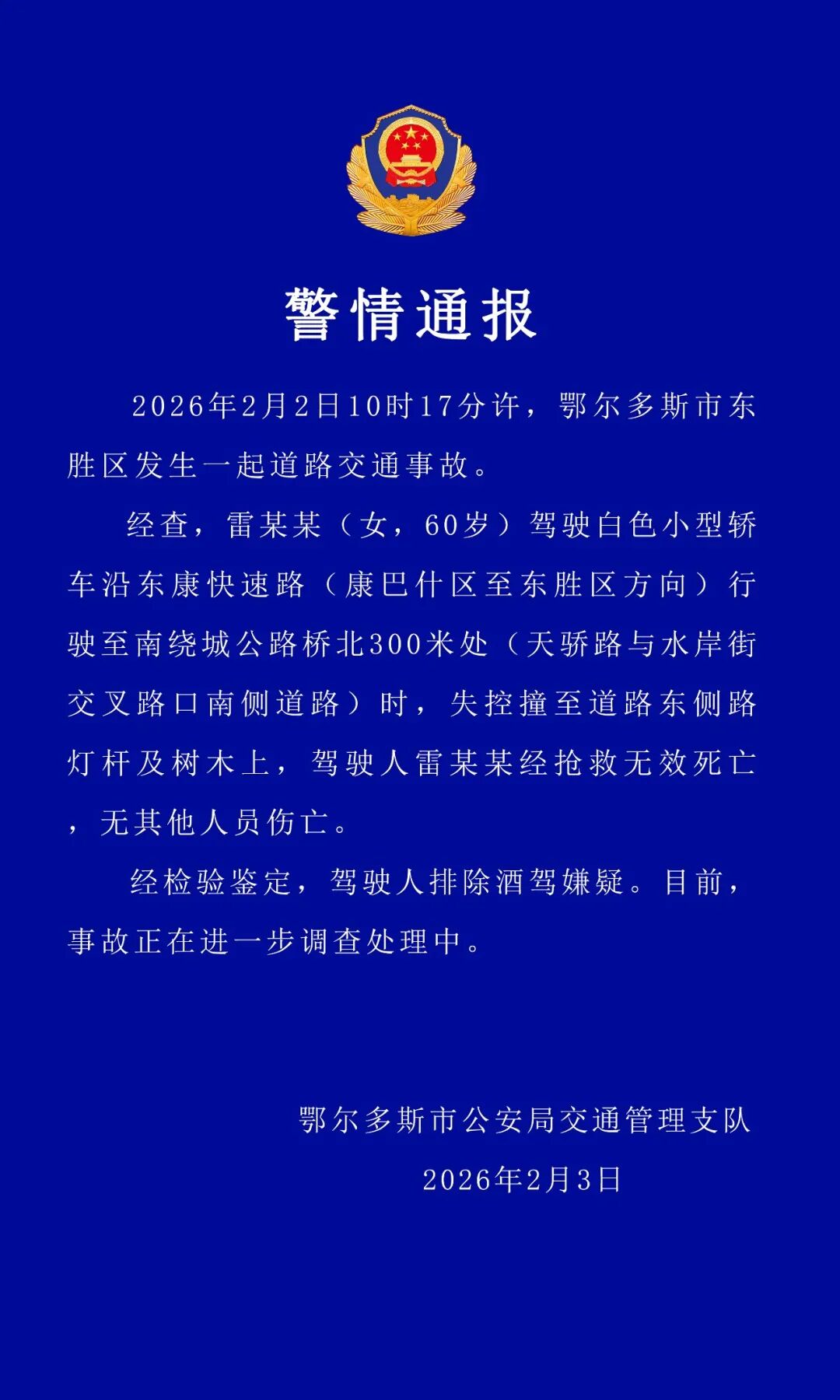 央视网消息:2月3日,内蒙古鄂尔多斯市公安局交通管理支队发布警情通报。2026年2月2日10时17分许,鄂尔多斯市东胜区发生一起道路交通事故。