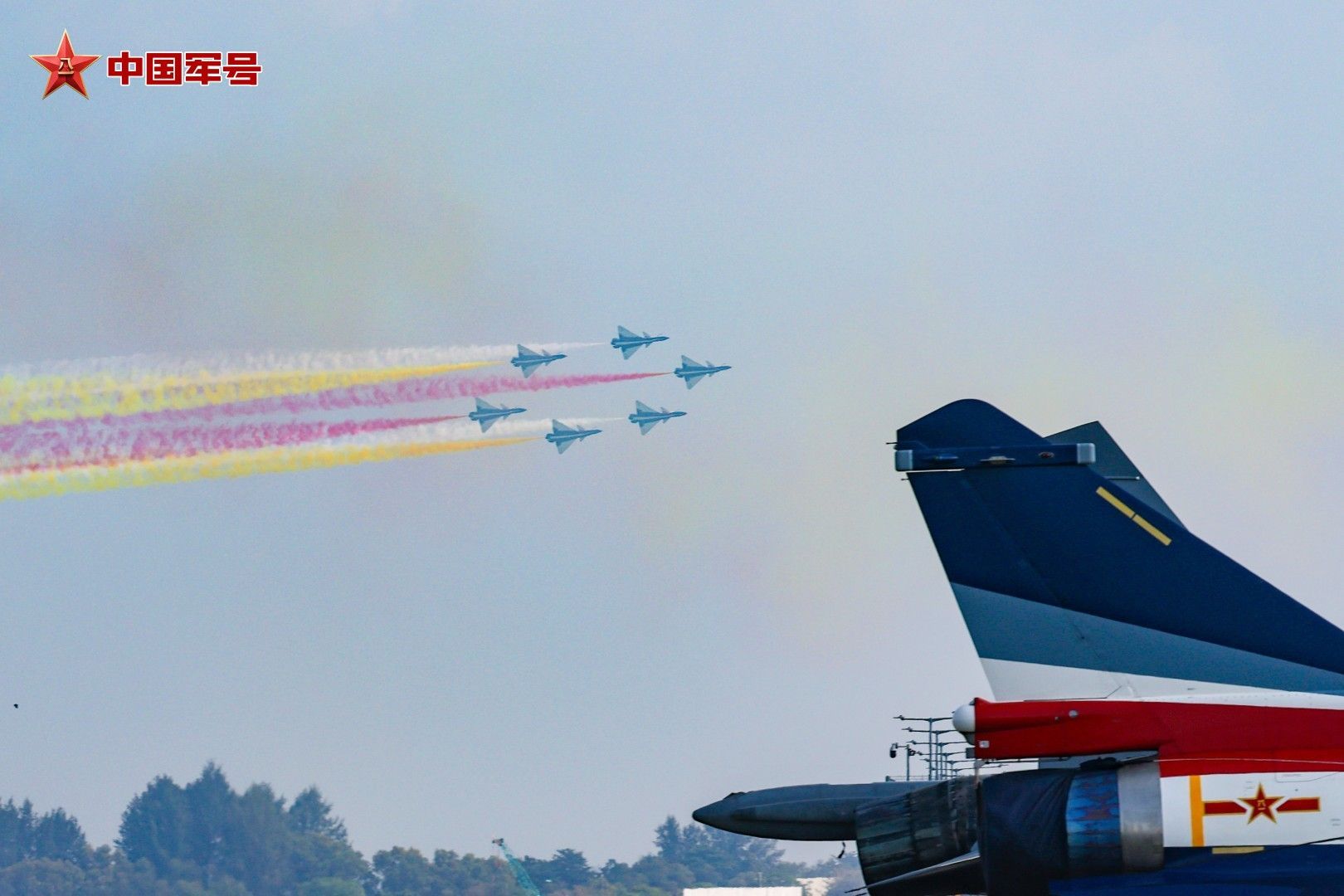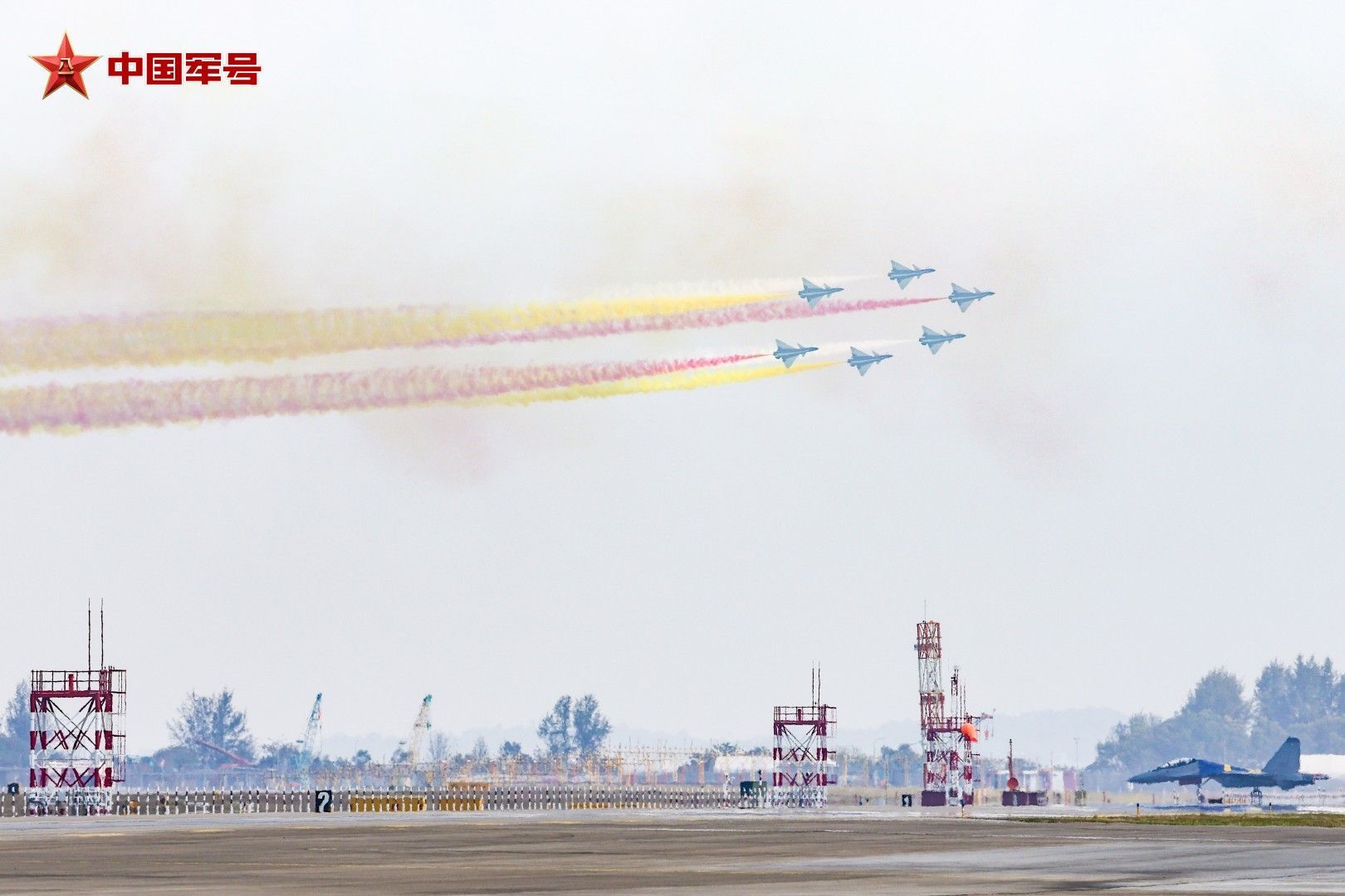 碧海蓝天之间,战鹰诗意起舞。抵达表演空域后,6架歼-10表演机率先进行六机超密集编队通场,拉出象征中新两国国旗颜色的红、黄、白三色彩烟低空掠过海面,六道彩色航迹犹如彩虹一般,勾勒出优美多姿的轨迹。随后,五机、四机、双机、单机等特技动作有序衔接,编队整齐划一、动作流畅紧密。