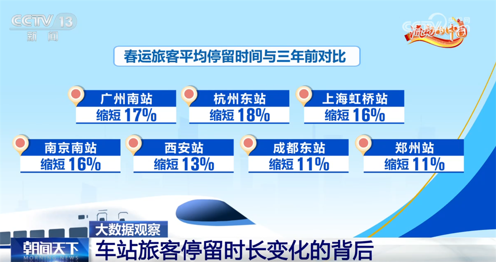 而旅客停留时间缩短的现象不只在广州南站,大数据发现,在比较繁忙的几个车站,旅客平均停留时间也都比三年前的春运同期缩短了10%以上。