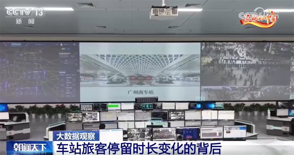 在广州南站安全生产指挥中心大厅,208块屏幕实时闪动,站内所有运输数据和实时人员流动数据全都汇集于此。