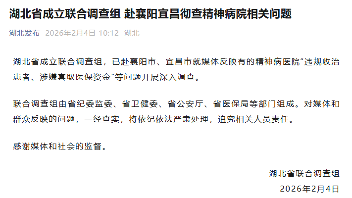 央视网消息:“湖北发布”消息,湖北省成立联合调查组,已赴襄阳市、宜昌市就媒体反映有的精神病医院“违规收治患者、涉嫌套取医保资金”等问题开展深入调查。联合调查组由省纪委监委、省卫健委、省公安厅、省医保局等部门组成。对媒体和群众反映的问题,一经查实,将依纪依法严肃处理,追究相关人员责任。