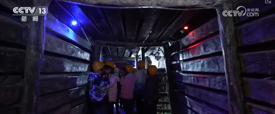 坐上观光小火车,穿过一条仿佛跨越时空的隧道,直达矿山探秘区。
